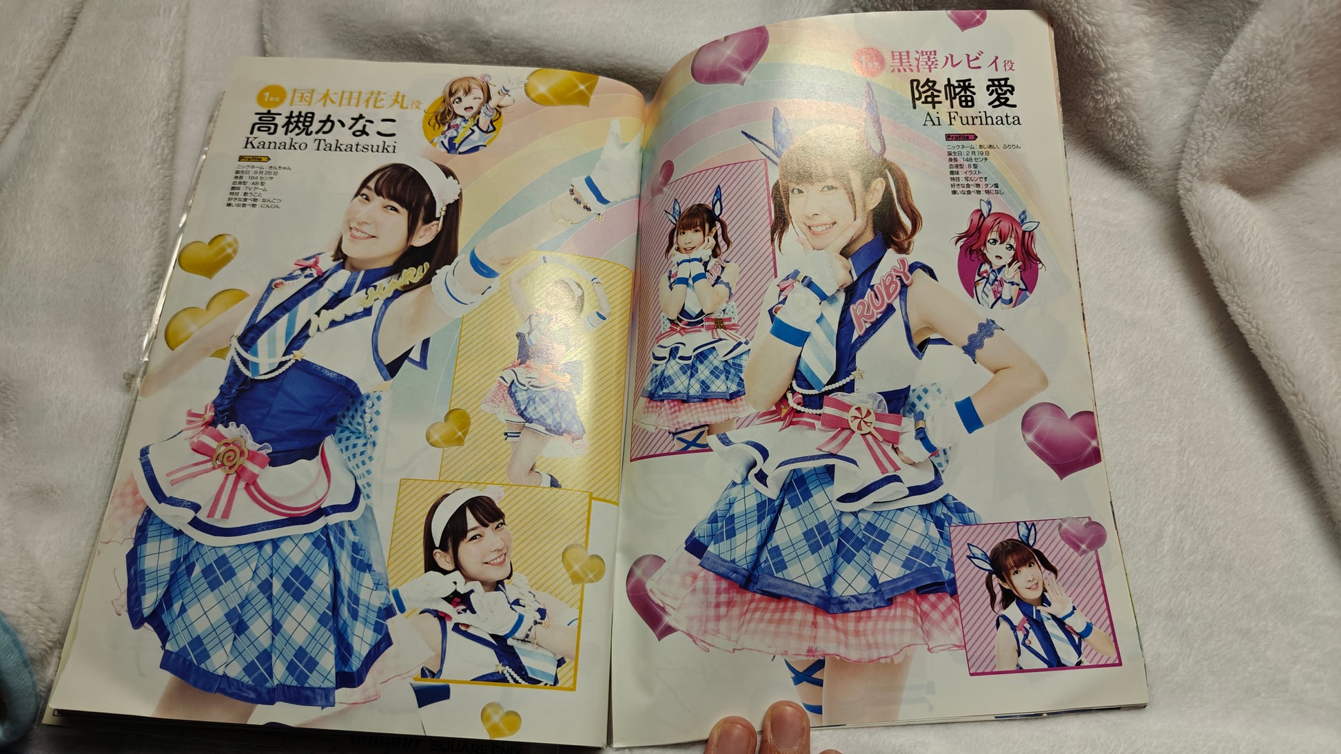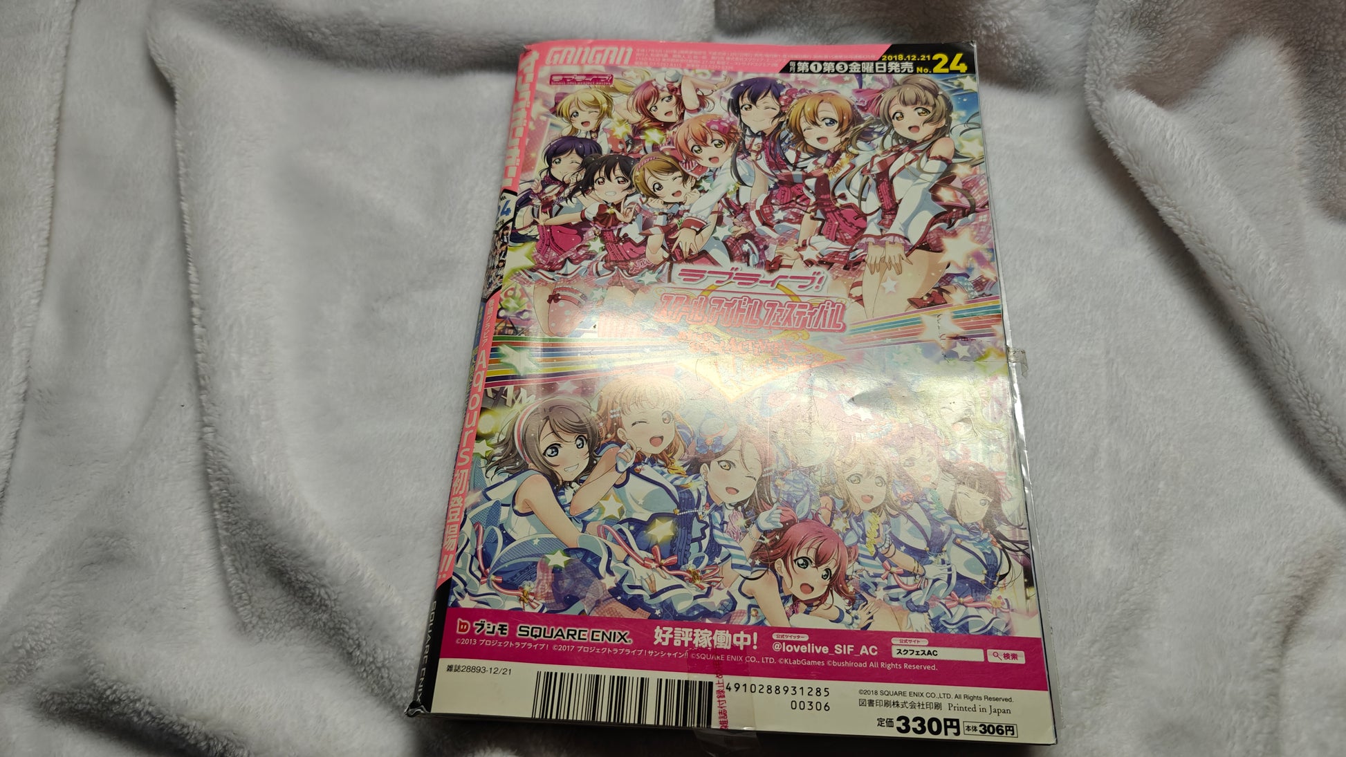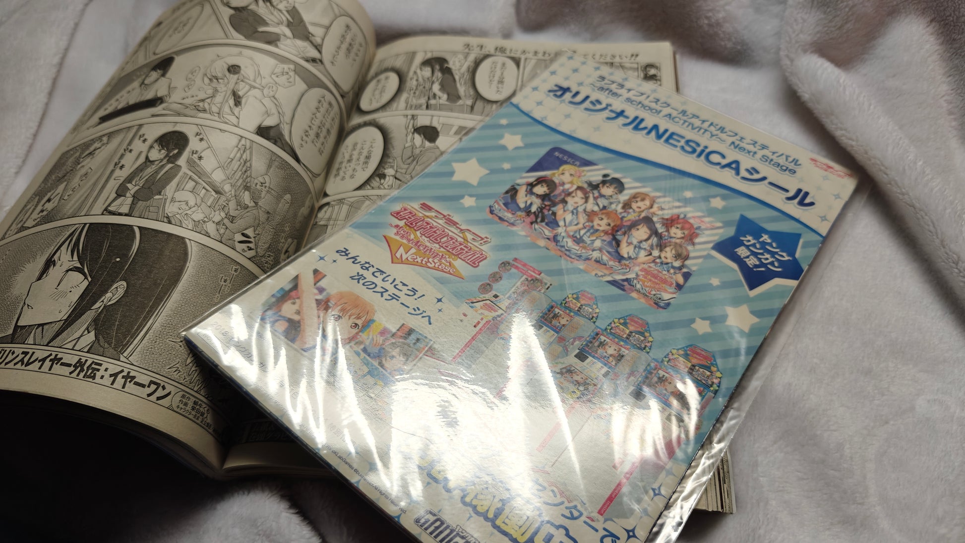 Nudity in some of the comics. Lots of boobs. I tore the cover by accident removing the tape. The front has color pages about each Aqours member/seiyuu and there is a sealed poster of all of them together.